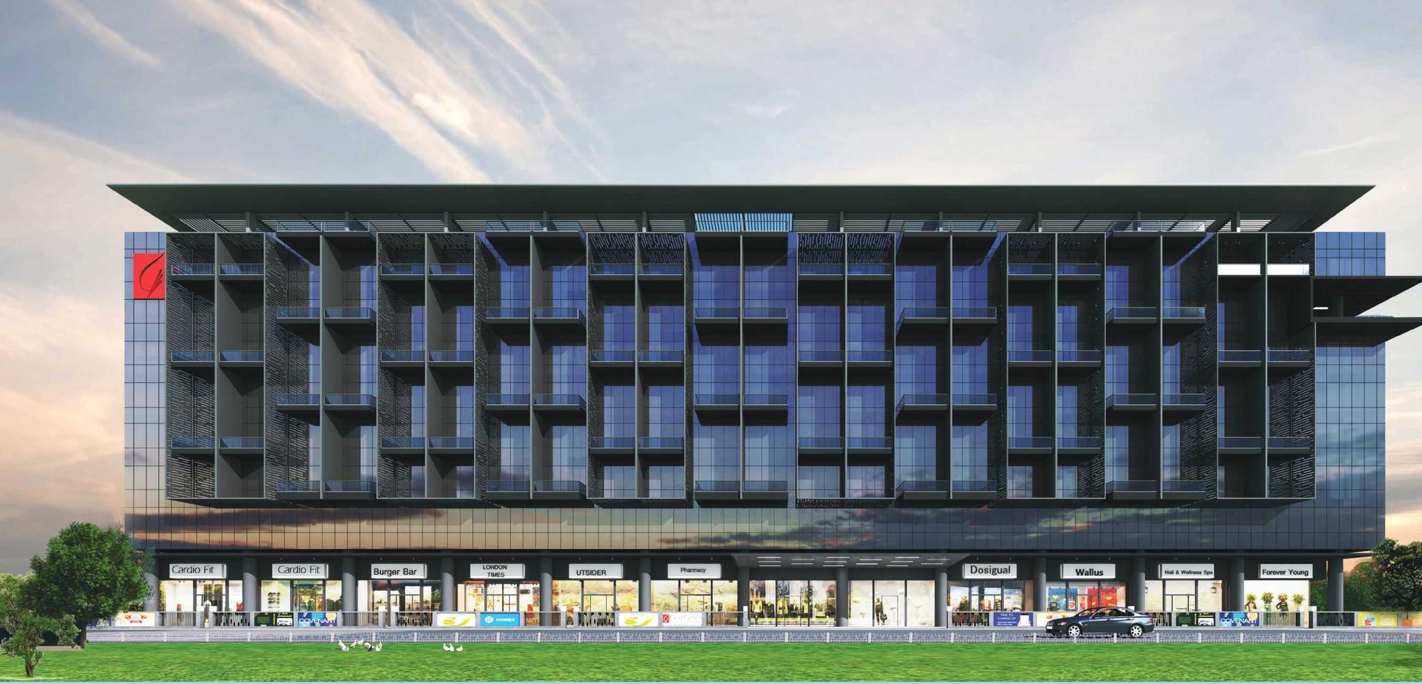 - Mix of retail showrooms, office spaces, and dining options.