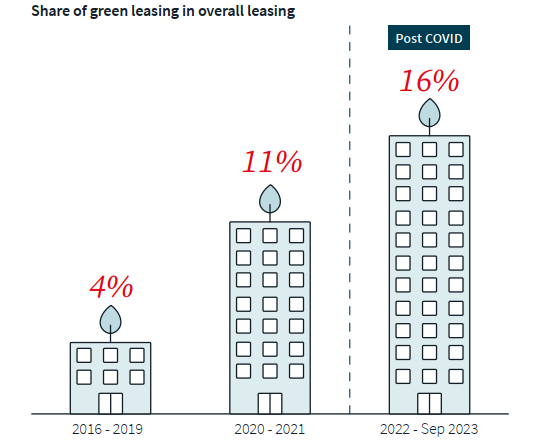 2 – 4% to 16% Increase in the share of green leasing in overall office leasing; Pre-COVID (2018 –19) to post-COVID (2022 –Sep)